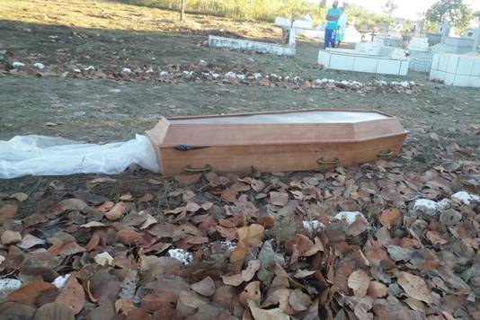 A foto caiu nas redes sociais e logo despertou a revolta de internautas e de moradores da região, que comentaram que o plástico utilizado para envolver o caixão foi retirado pelos coveiros sem a devida proteção.