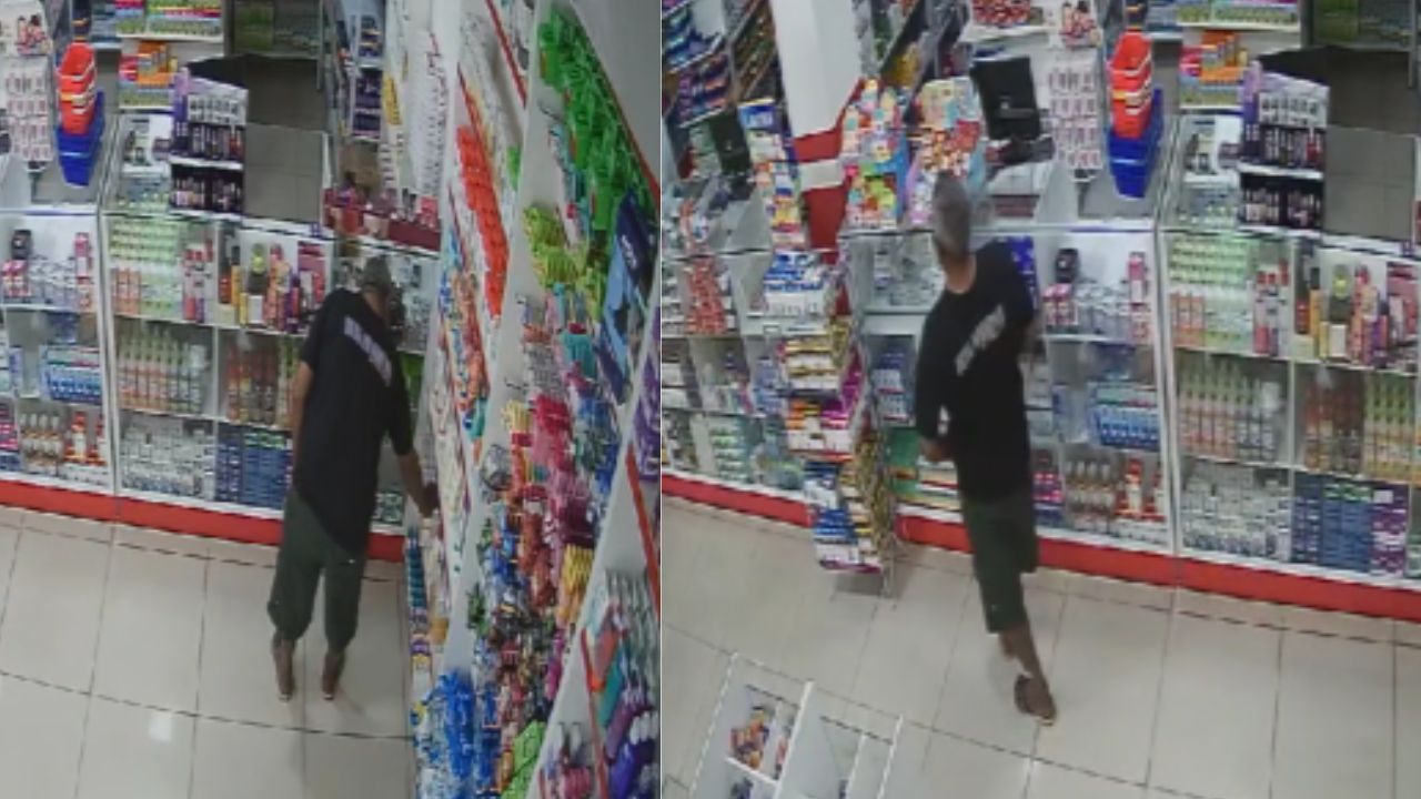 Nas imagens registradas pelas câmeras do local, nesta quinta-feira (27), o idoso aproveita que uma farmacêutica está atendendo uma pessoa e vai em direção a uma prateleira.