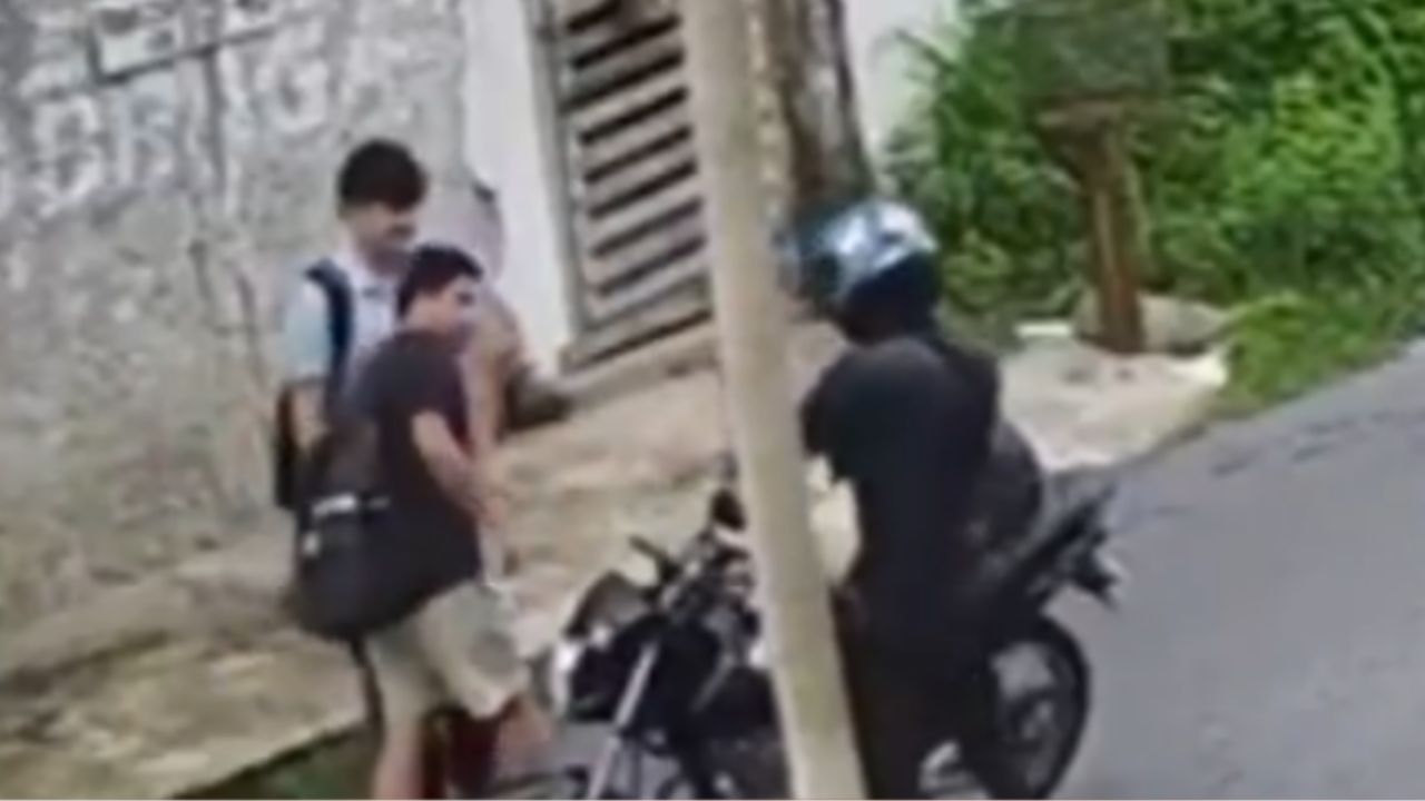 Nas imagens, um bandido aparece em uma moto e aborda dois rapazes na via. Sem reagir, eles entregam o celular ao assaltante.