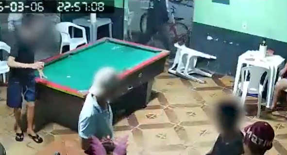 Uma câmera flagrou o momento em que ele está sentado numa cadeira de plástico, por volta das 11h, quando criminosos armados entram no estabelecimento. Um deles arrasta a vítima na cadeira para fora do bar.