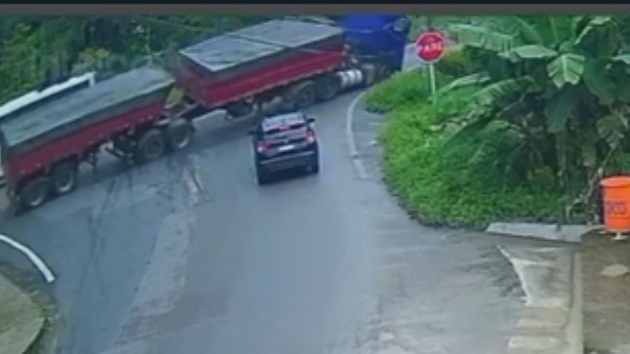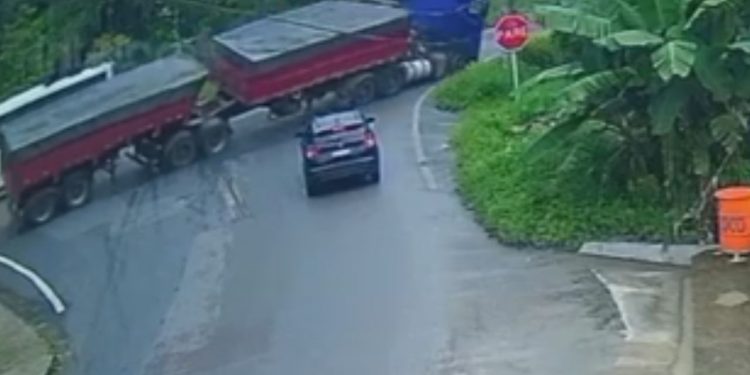 MANAUS (AM) – Uma câmera registrou o exato momento em que uma carreta tombou e saiu derrubando um poste de energia no quilômetro 1, na BR-174.