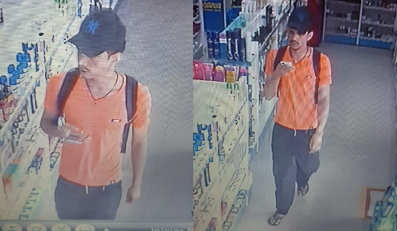 O suspeito chegou ao estabelecimento fingindo que ia usar um caixa eletrônico. Ele fica perto de algumas prateleiras e coloca alguns produtos dentro dos bolsos da calça sem chamar a atenção de nenhum funcionário.