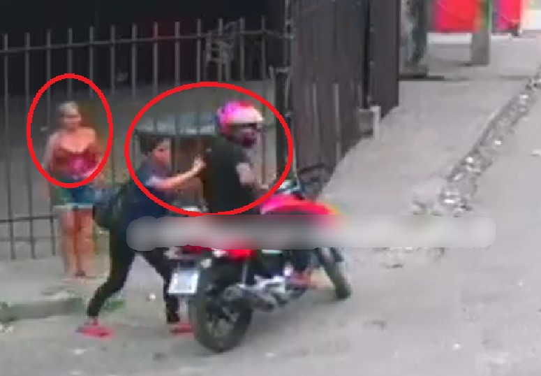 Um vídeo que circula nas redes sociais mostra o momento em que o crime acontece. A mulher está mexendo no celular quando o casal aparece na moto e anuncia o assalto.