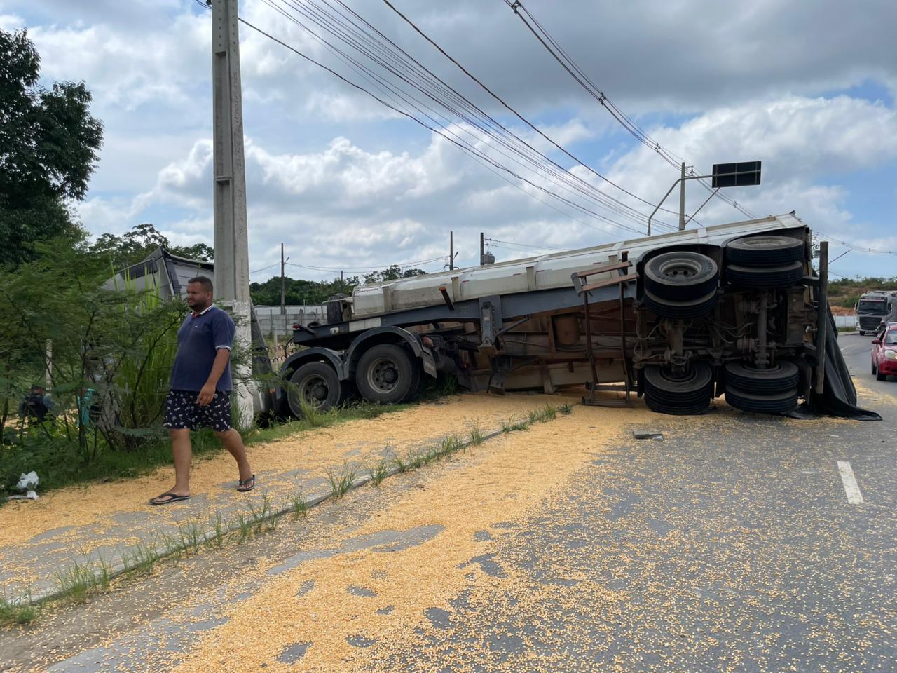 O condutor relatou que foi fechado por um carro na curva e, ao frear, a carga pesada fez com que o veículo tombasse.