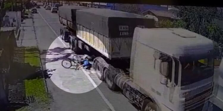 Nas imagens é possível ver o ciclista andando no acostamento da rodovia. Pouco depois, o caminhão aparece e encosta no homem, que se desequilibra e cai quase embaixo do veículo. As pernas dele ficam próximas das rodas.