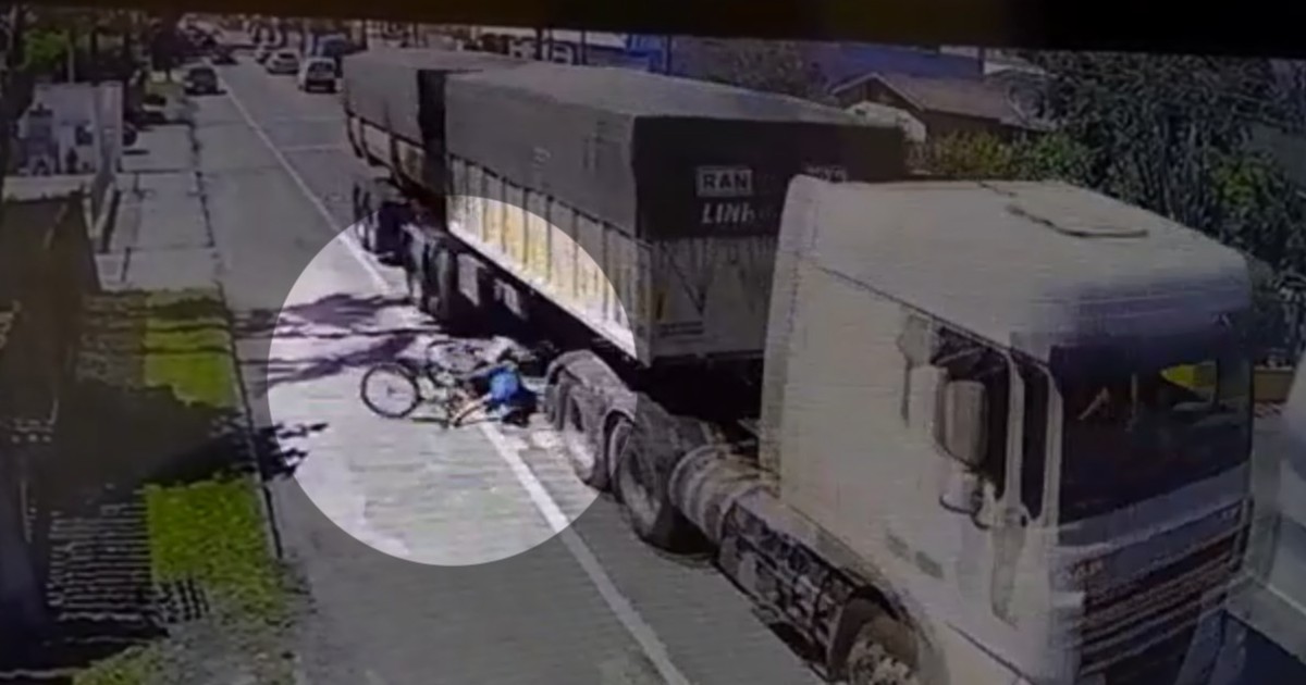 Nas imagens é possível ver o ciclista andando no acostamento da rodovia. Pouco depois, o caminhão aparece e encosta no homem, que se desequilibra e cai quase embaixo do veículo. As pernas dele ficam próximas das rodas.