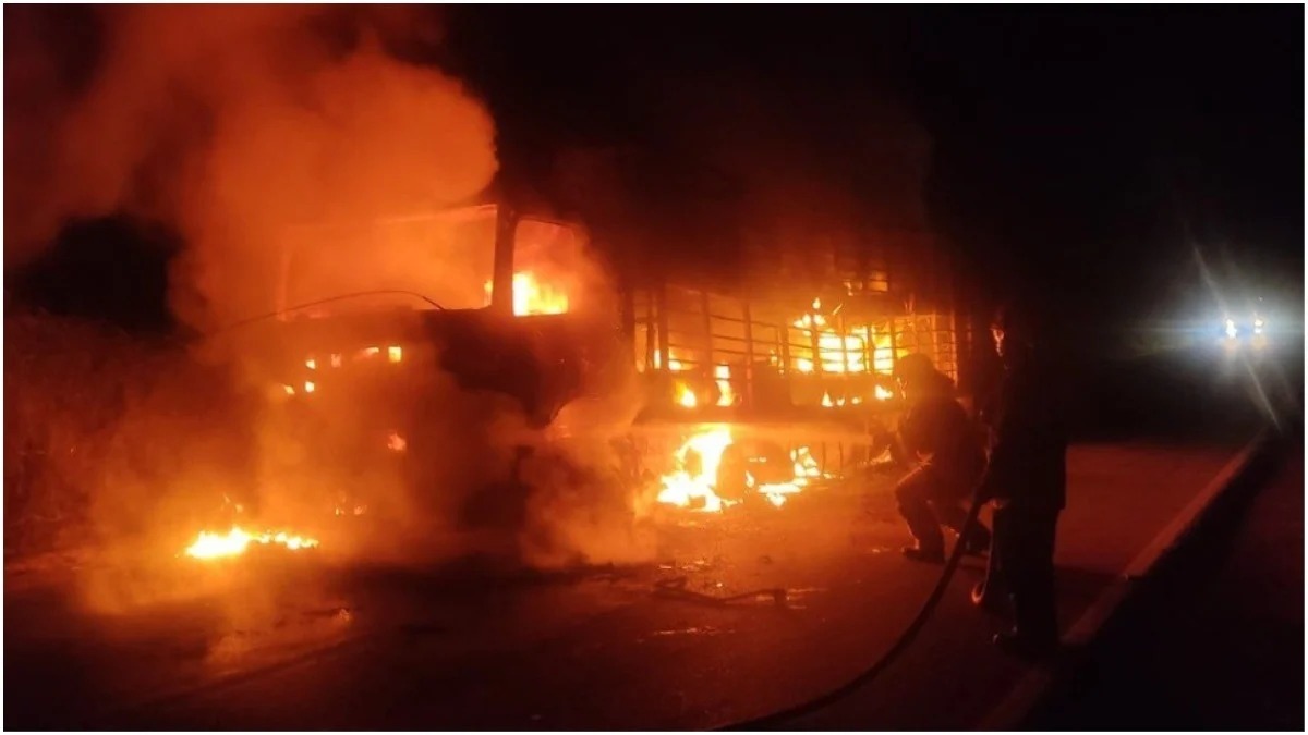 “Quando chegamos ao local, o fogo já havia tomado todo o caminhão. Segundo o motorista, as chamas teriam começado na parte traseira do veículo, o que o impossibilitou de soltar os animais. Com o uso de mangueiras de combate a incêndios, nossa equipe apagou as chamas e realizou o rescaldo, para evitar que o fogo voltasse”, detalhou o Sargento Nascimento, chefe da equipe que atendeu a ocorrência.