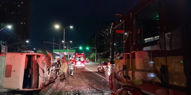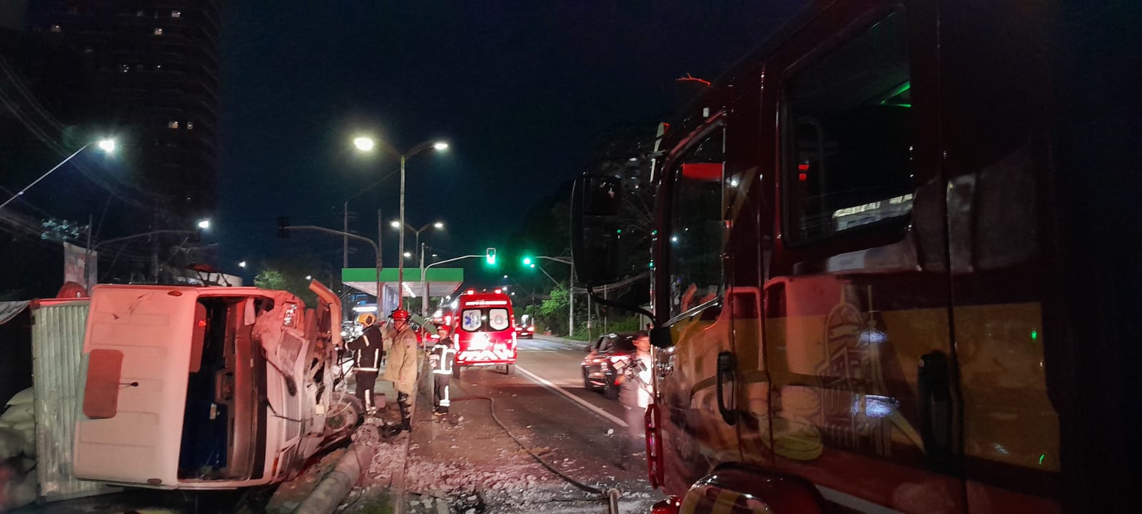 De acordo com o Corpo de Bombeiros, o motorista do caminho perdeu o controle do veículo após passar por uma lombada, subiu l canteiro central, bateu em um poste e tombou.