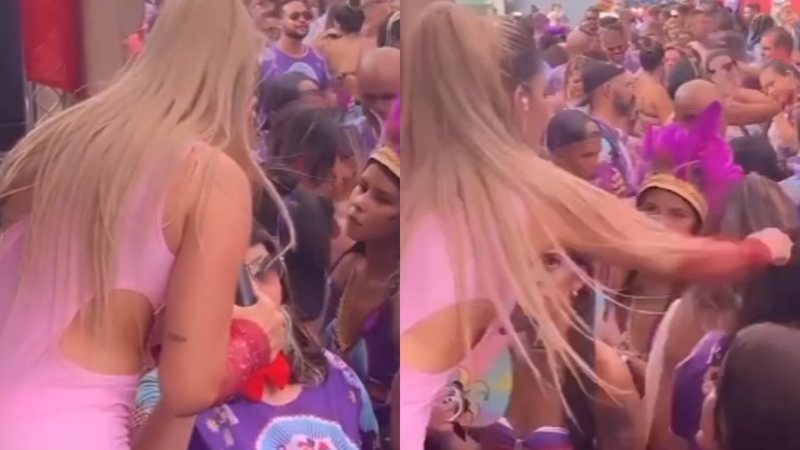 A artista tentou tomar o microfone, mas a mulher não queria soltar. Quando conseguiu pegar de volta, a pagodeira se indignou e deu um cascudo nela. No vídeo é possível ver que a mulher tenta reagir, mas é contida pelos seguranças da cantora.