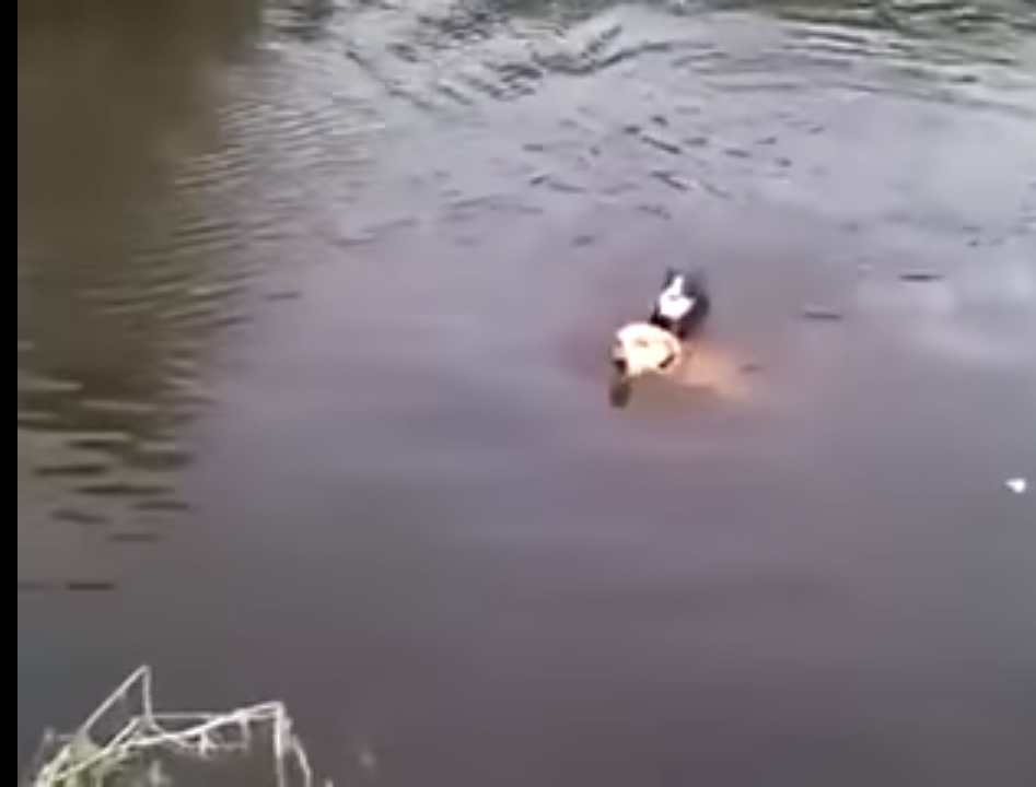 O cão percebendo que o gatinho estava se afogando em um lago, pulou na água fria e conseguiu fazer o resgate do animal, que se agarrou às suas costas. O local que ocorreu o fato é desconhecido.