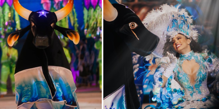 O boi azul e branco abriu a segunda noite do festival com o subtema “Amazônia-Aldeia: o brado do povo”. O espetáculo retratou a pluralidade e resistência dos povos e comunidades tradicionais da Amazônia.