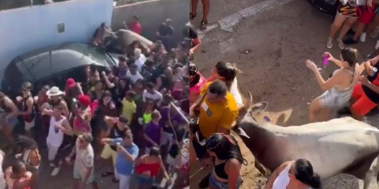 País – Em Pendências, no interior do Rio Grande do Norte, uma vaca resolveu dar um passo ousado em direção à fama carnavalesca, deixando um rastro de destruição e alguns foliões com a sensação de terem vivido momento de terror! O episódio inusitado aconteceu na última segunda-feira (12), quando o bloco de Carnaval local estava em pleno vapor.