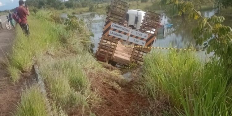 RORAIMA| Nesta quarta-feira (21), uma carreta prancha que transportava dois rolos compactadores caiu em um igarapé localizado na BR-174, no município de Caracaraí, em Roraima.