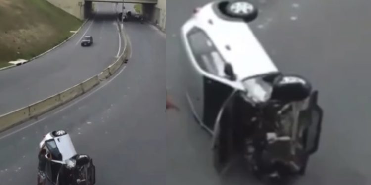 Um motorista capotou o carro no viaduto que dá acesso ao aeroporto de Manaus, entre a avenida Torquato Tapajós e a avenida do Turismo, zona Norte da capital. Pedestres passaram pelo local e filmaram o estado do veículo, que ficou destruído na pista.