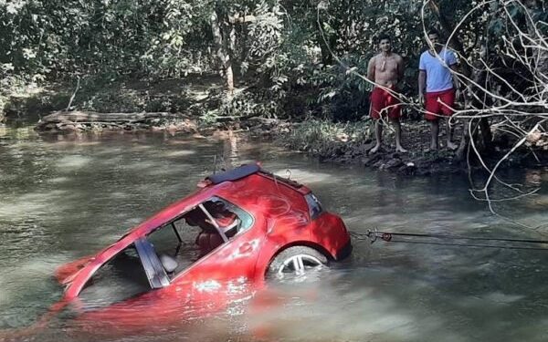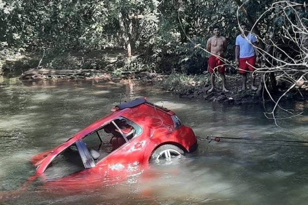 O Corpo de Bombeiros foi acionado por um homem que passava pelo local e viu o veículo na água. As equipes acessaram um poço onde era possível visualizar apenas as rodas e a parte do chassi do carro.