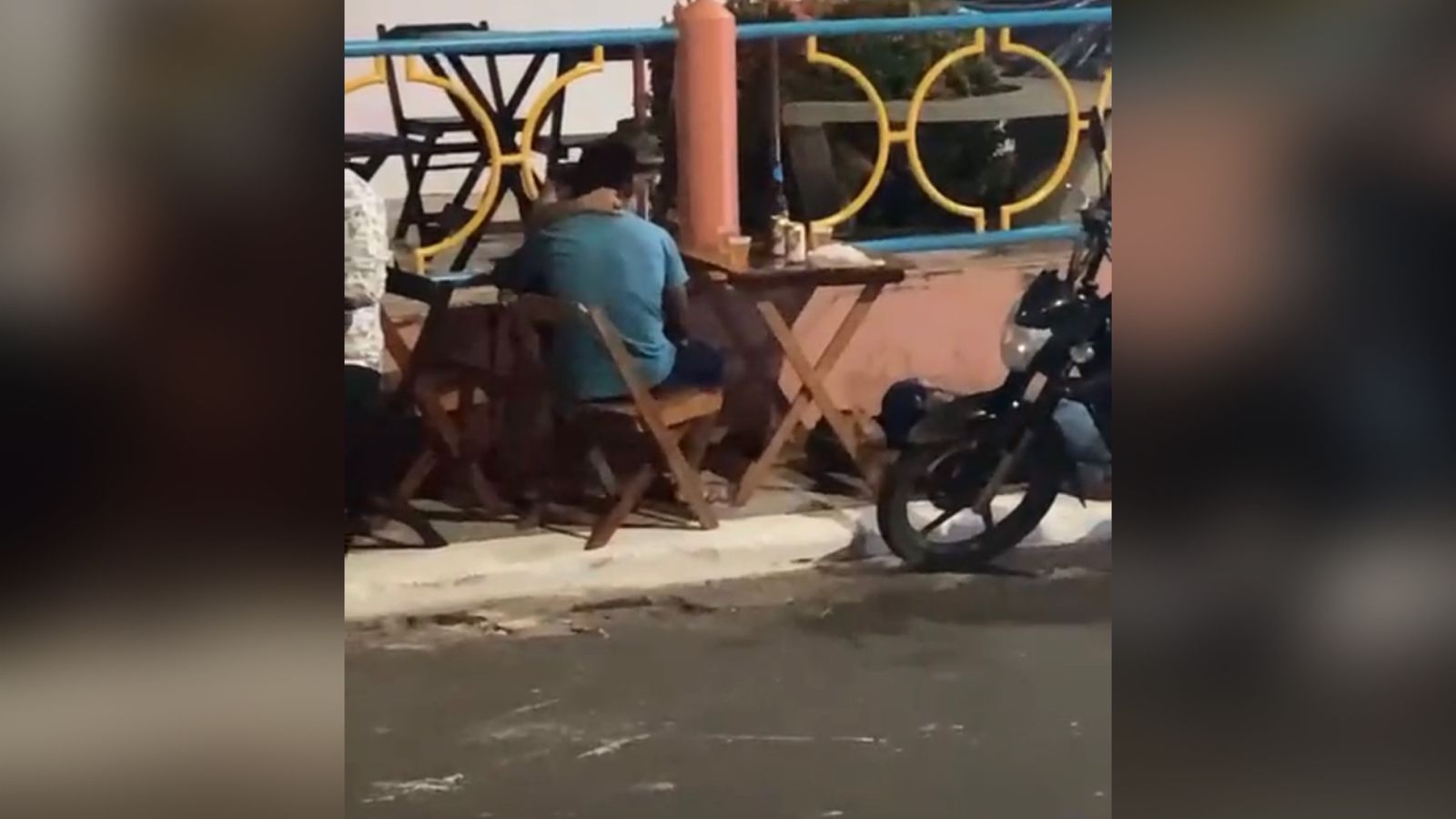O casal estava em um boteco conhecido da cidade e não se intimidou com a presença de outros clientes no estabelecimento. No vídeo, é possível ver que a mesa ao lado estava ocupada, com clientes bebendo e comendo normalmente, sem perceber o que estava acontecendo. Ainda no vídeo, é possível ver que um morador em situação de rua está deitado bem perto da mesa do casal safadinho, mas ele dorme sem perceber o movimento.