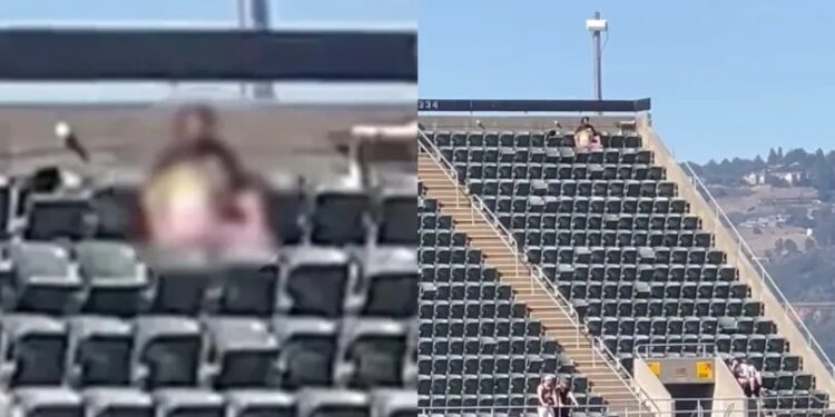Um vídeo publicado pelo blog TO nas redes sociais mostra uma mulher sentada em um homem na arquibancada do estádio.