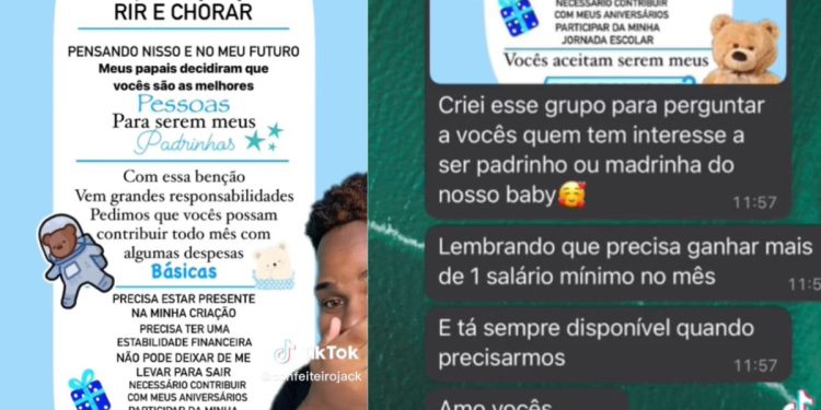O influenciador digital Confeiteiro Jack, de Salvador, compartilhou no TikTok o convite, que teria sido recebido pela prima de uma seguidora. A mãe, chamada “Rosana”, criou um grupo no WhatsApp e reuniu pessoas que ela considera querida e que possam apadrinhar o filho.