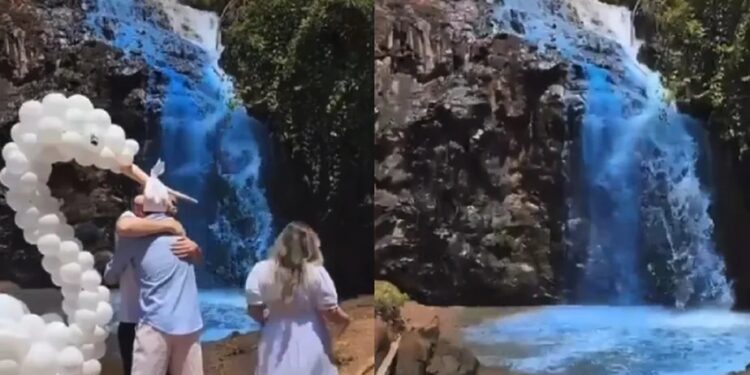 Um casal achou que seria uma boa ideia utilizar corante na Cachoeira do Queima-Pé, no município de Tangará da Serra, ao norte de Cuiabá, para anunciar que estão esperando um menino.