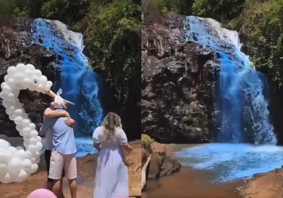 Um casal achou que seria uma boa ideia utilizar corante na Cachoeira do Queima-Pé, no município de Tangará da Serra, ao norte de Cuiabá, para anunciar que estão esperando um menino.