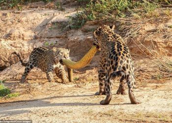 PANTANAL (MT) - Um fotografo conseguiu registrar um momento magnifico onde uma mamãe onça e seu filhote brincam de cabo...