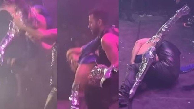 Empolgada, Joelma, que faz as próprias coreografias, caiu durante uma das piruetas depois de abrir as pernas demais durante o giro. A sorte foi que o bailarino viu a tempo e a cantora despencou por cima dele.