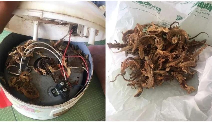 Na primeira imagem, é possível ver dezenas de animais mortos dentro da panela elétrica de arroz. Já na segunda foto, as lagartixas aparecem em cima de um papel, após serem retiradas do utensílio doméstico.