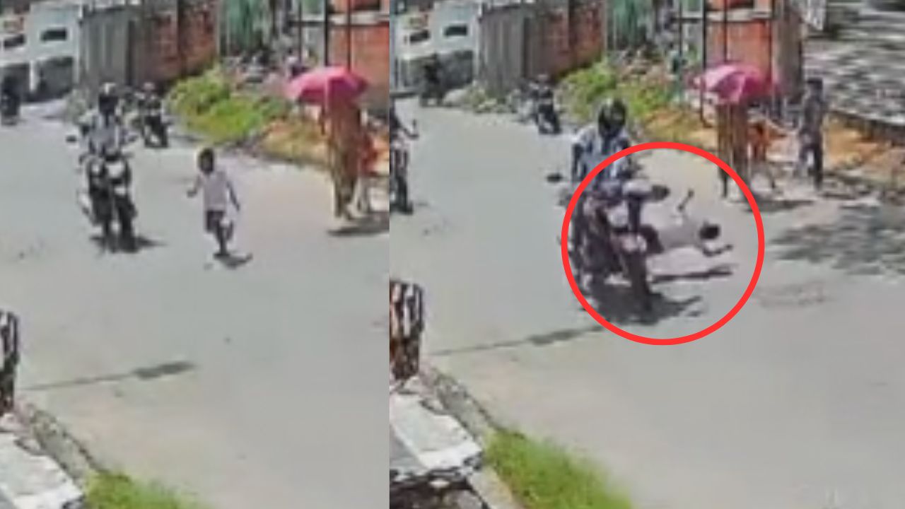 Nas imagens, a criança, de idade não informada, estava andando pela rua com a mãe, quando acaba largando a mão dela e correndo para o outro lado da rua. Nesse instante, ele é atropelado pela motocicleta. O impacto fez o menino ser arremessado na pista.