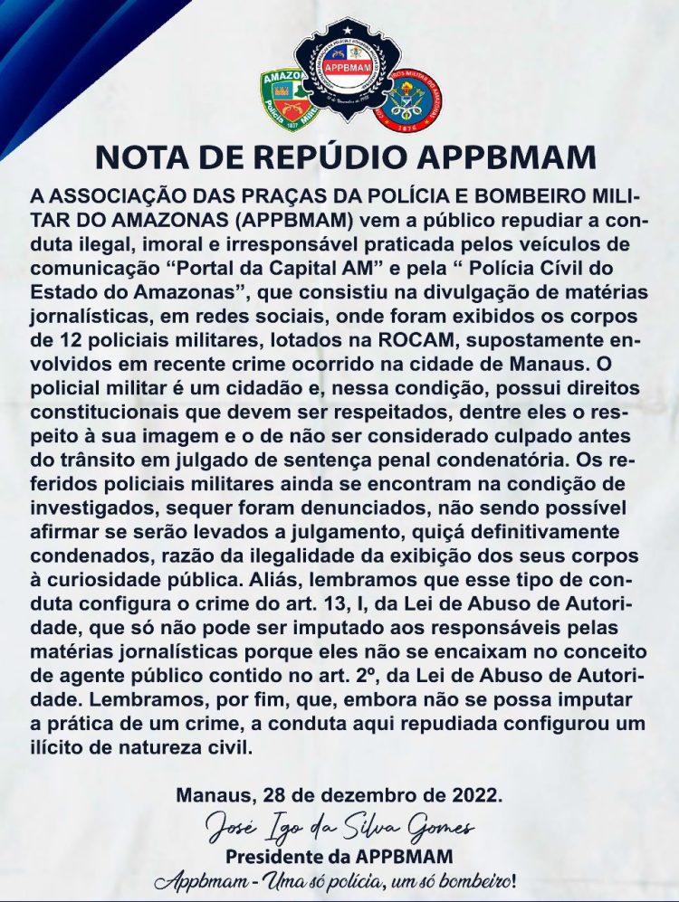 MANAUS (AM) – A Associação das praças da Polícia e Bombeiro Militar do Amazonas (APPBMAM) divulgou uma nota de repúdio criticando a divulgação das fotos dos 12 policiais suspeitos de participarem da chacina de quatro pessoas no último dia 21, na AM-010.