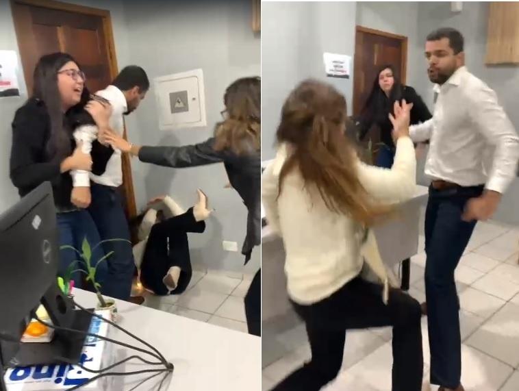 A violência foi registrada por outra funcionária e o vídeo, que circula nas redes sociais, mostra o homem dando chutes e socos contra a colega de trabalho, que ficou com o rosto ensanguentado. O procurador estava no meio de outras mulheres que acabaram sendo agredidas também.