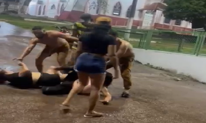 MANAQUIRI (AM) – Nem mesmo o temporal que castigou Manaquiri, a 60 km de Manaus, conseguiu esfriar os ânimos de duas mulheres que transformaram uma rua alagada em ringue de pancadaria no último domingo (10). O vídeo da briga mostra as rivais trocando tapas, puxões de cabelo e até rolando na água da chuva em frente à Igreja São Pedro, na rua Esteliano dos Santos.