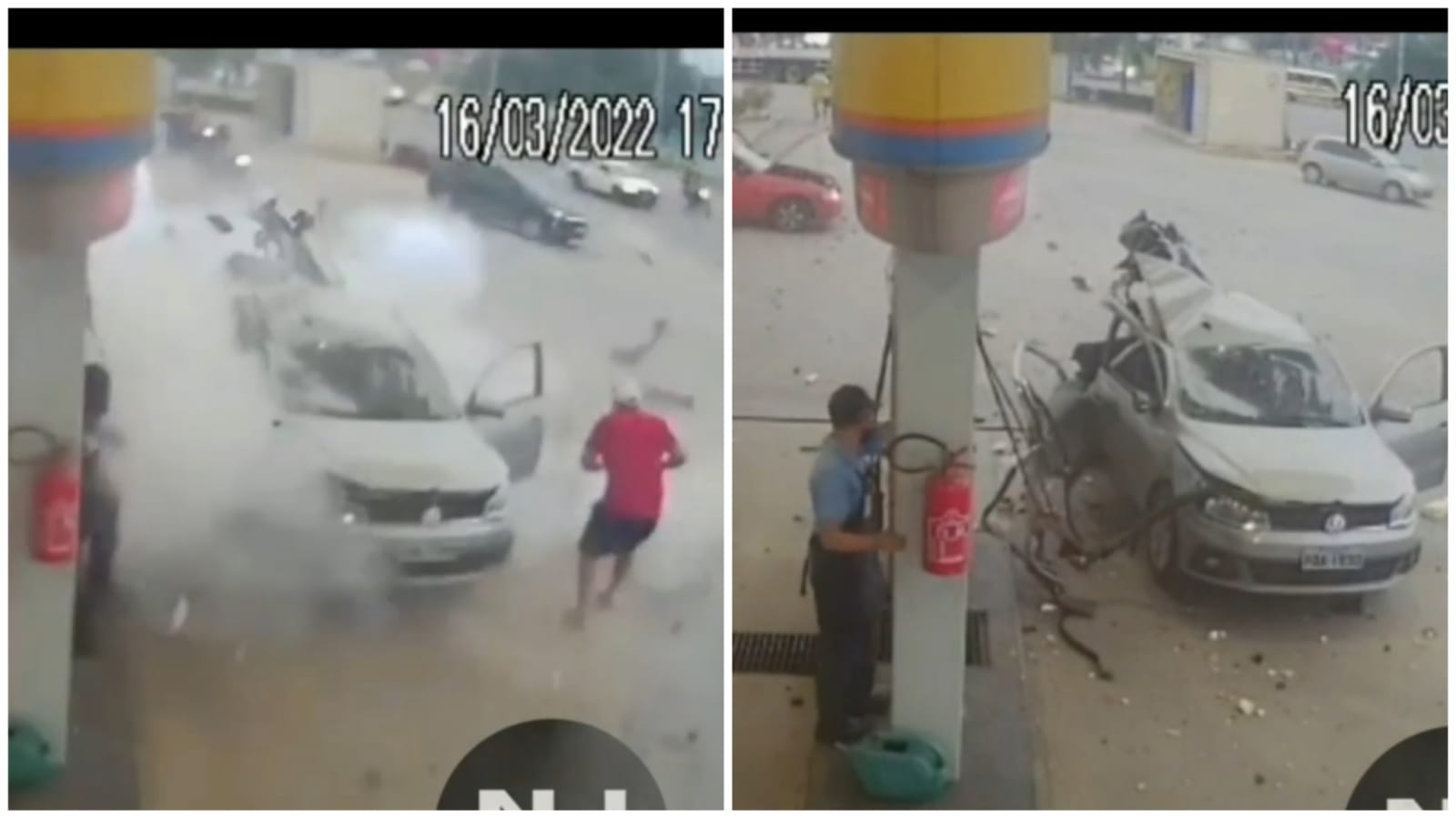 As imagens mostram o motorista do veículo aguardando do lado de fora enquanto o carro é abastecido por um frentista. Em seguida, a explosão acontece e destrói a parte traseira do carro. O proprietário corre assustado e o funcionário desliga o gás.
