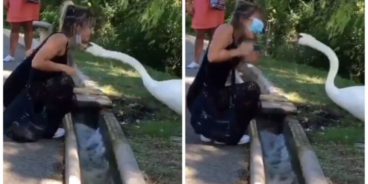 Para admirar melhor o animal, a mulher se abaixou na frente do cisne com a máscara no queixo. Eis que, inesperadamente, a ave puxa a máscara e solta no rosto de sua admiradora.
