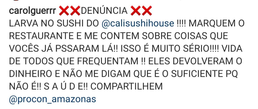 Manaus-AM| Uma cliente do restaurante Cali Sushi House, divulgou na noite desta sexta-feira (21) em sua rede social, fotos e um vídeo onde mostra uma larva saindo do alface que acompanha seu pedido.