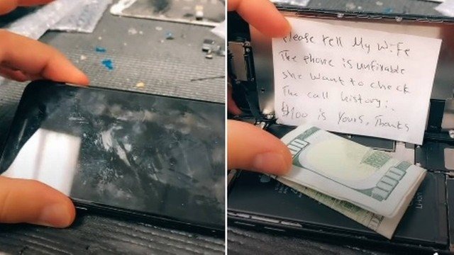 Dentro do celular, escondidos na capa do aparelho, estavam uma nota de cem dólares e um bilhete, que dizia: