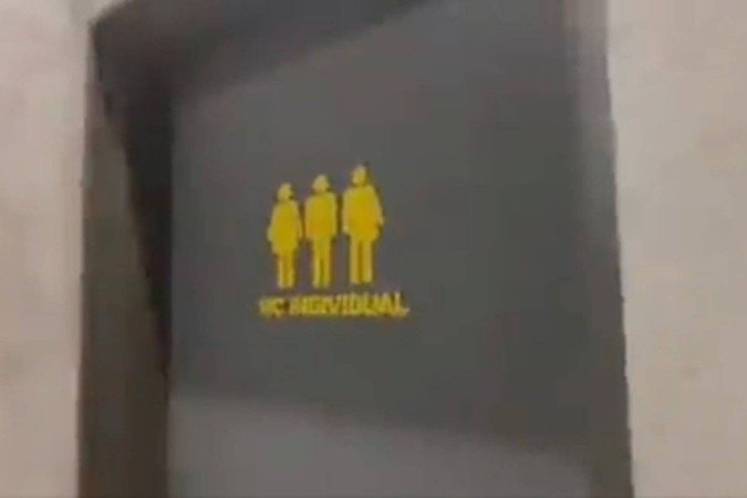 Ela continua dizendo que não quer usar o mesmo banheiro “com homem, com mulher, onde todo mundo usa o mesmo banheiro”. A placa na porta do banheiro indica, porém, que o uso das cabines é “individual”.