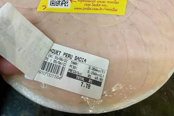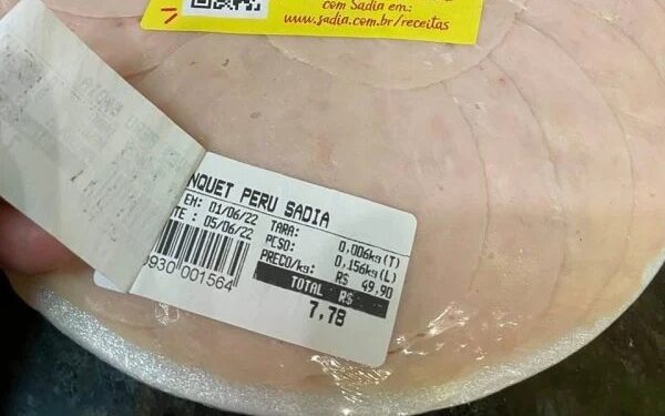 Em uma das gravações, feita nessa segunda-feira (6/6), uma consumidora apresenta um blanquet de peru posto à venda com prazo de validade até 9/6. Mas, ao destacar a segunda etiqueta, o limite de consumo original do alimento é, na realidade, 5/6.