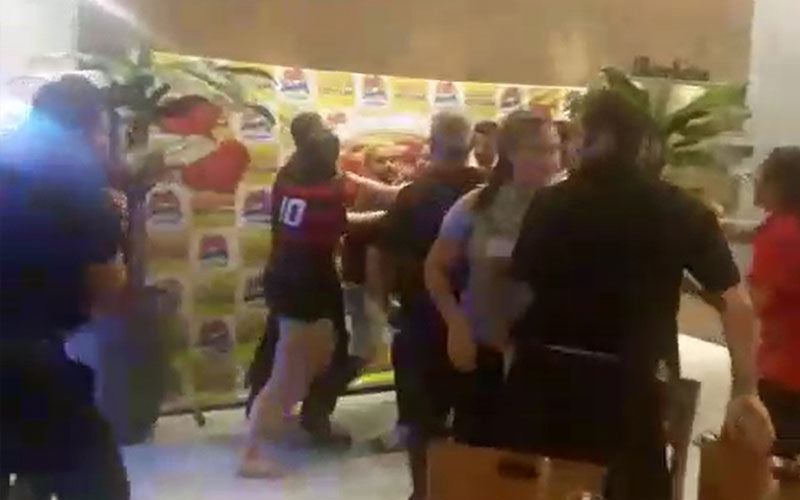 Nas imagens, é possível ver um grupo discutindo até que um homem desfere o primeiro soco, e a pancadaria começa. Uma mulher chega a pegar uma cadeira para defender o companheiro, mas tem o objeto tomado.