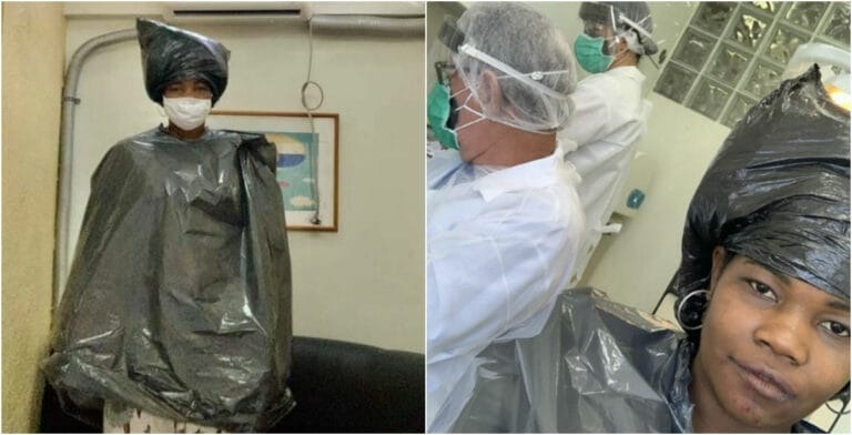 Cristiane relatou que teve de usar saco de lixo preto em cima de suas roupas e enrolado em seu cabelo para ser atendida pelo dentista e realizar uma cirurgia na gengiva. A clínica alegou que não havia mais equipamentos de proteção individual, por isso era necessário fazer uso do saco plástico.