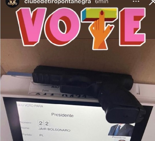 Uma postagem atribuída ao Clube de Tiro da Ponta Negra está causando polêmica neste domingo (2). Nela aparece uma arma e a foto de Bolsonaro no que seria uma urna na hora do voto.
