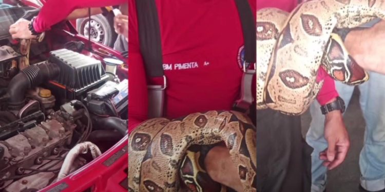 MANAUS-AM| Nesta terça-feira (31), o motorista de um carro foi surpreendido por uma cobra do tipo jiboia dentro do motor de seu veículo. O homem precisou acionar o Corpo de Bombeiros para retirar o animal. O caso aconteceu no bairro Praça 14, zona Sul de Manaus.
