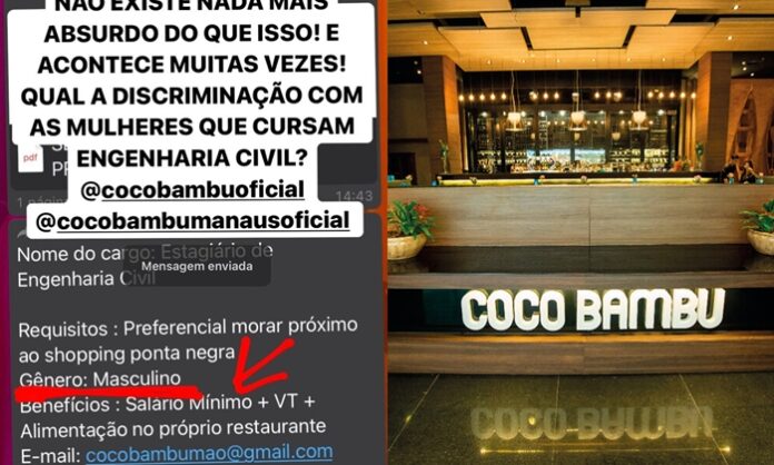 MANAUS – AM | O renomado restaurante de Manaus Coco Bambu está sendo criticado nas redes sociais e acusado de discriminar mulheres, estudante de engenharia civil, para ocupar cargo de estágio no estabelecimento.
