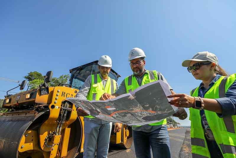 MANAUS (AM) – O governador Wilson Lima vistoriou, nesta sexta-feira (28/07), a etapa final dos trabalhos no Complexo Viário Anel Sul, que já alcança 96% de execução. A duplicação da estrada do Tarumã, na zona oeste de Manaus, contempla 8,7 quilômetros da via, dos quais 8,1 quilômetros já estão totalmente pavimentados. Resta um trecho de 600 metros, nas proximidades do Sistema de Vigilância da Amazônia (Sivam), que começou a receber a aplicação da primeira capa asfáltica durante a vistoria.