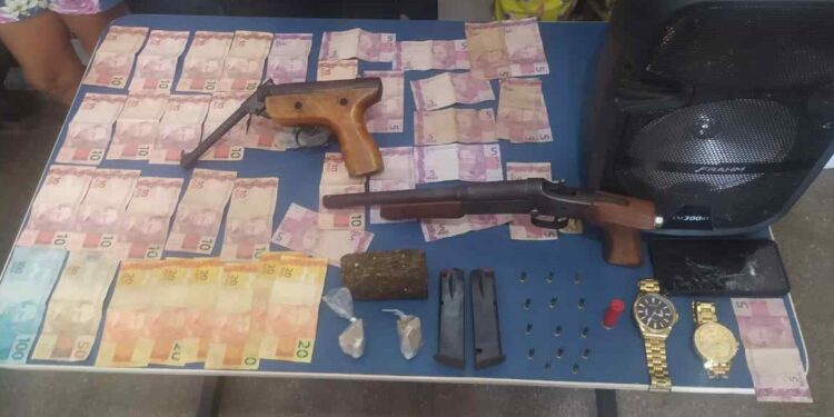 A guarnição seguiu até o endereço e, com a autorização dos suspeitos, entraram na casa, onde foram encontrados uma arma de fogo tipo escopeta calibre 32; uma pistola calibre 22 adaptada artesanalmente; 14 munições calibre 22 intactas e uma deflagrada; um cartucho calibre 32 intacto; 216,4 gramas de maconha; 52 gramas de material entorpecente semelhante a pedra de oxi; um aparelho celular; uma caixa de som; três relógios de pulso; um televisor; e R$ 510 em espécie.