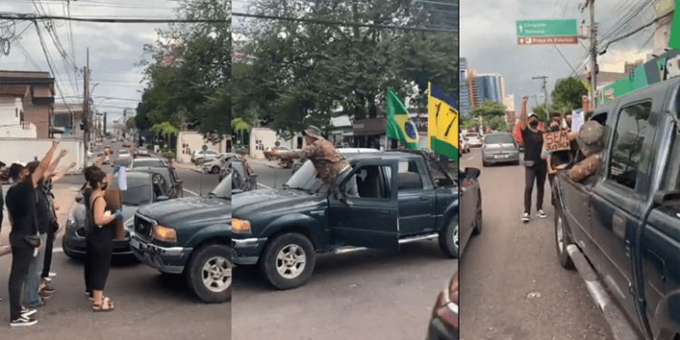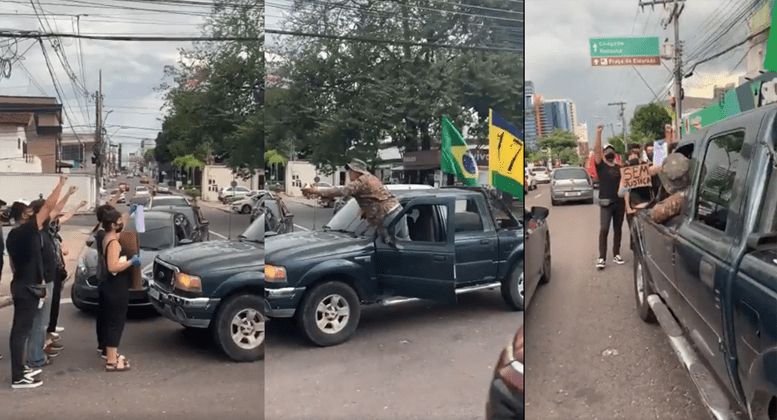 Munido de uma bandeira verde e amarela estampada com o rosto do presidente da República, o homem enfrentou um grupo isolado que encontrava-se na manifestação, tentando ultrapassar a barreira construída por eles na frente do veículo. Em silêncio, os jovens escutaram xingamentos e palavras de baixo calão proferidas pelo condutor.