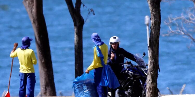 BRASÍLIA | O presidente Jair Bolsonaro, diagnosticado com Covid-19, passeou de moto na área externa do Palácio da Alvorada nesta quinta-feira, 23. Sem usar máscara, o presidente parou para conversar com trabalhadores que faziam a limpeza na área.