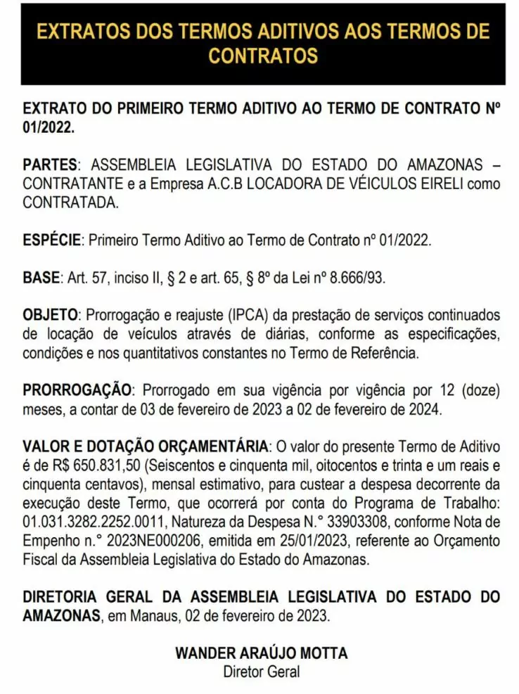 A Aleam já gastou esse ano quase R$ 8 milhões com renovação de contratos de locação de veículos. De acordo com publicação do Diário Oficial da Casa Legislativa, do dia 13 de fevereiro deste ano, o Contrato 01/2022 foi prorrogado até fevereiro de 2024 e determina pagamento mensal de R$ 650.831,50, resultando no valor de R$ 7.809.978,00 para a empresa ACB Locadora de Veículos Eirelli. Só em 2022, ela já recebeu R$ 7.374.825,00 milhões, totalizando o montante de R$ 15.184.803,00 milhões pelo serviço.
