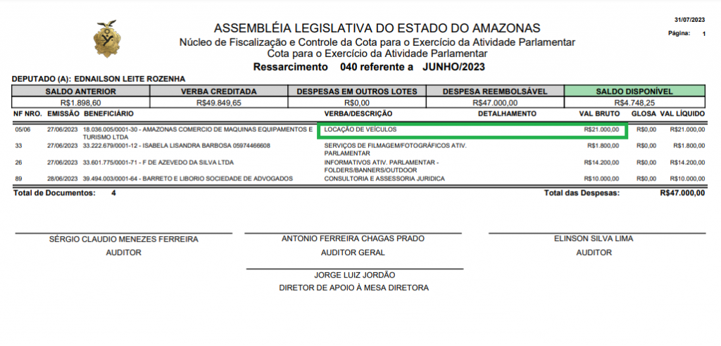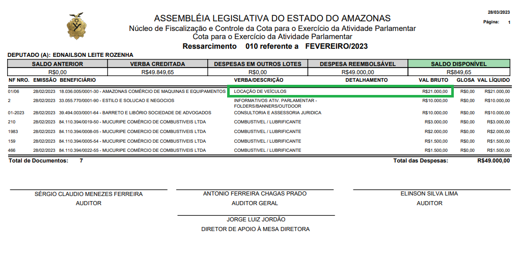 O valor é relativo ao primeiro semestre de 2023 e os dados mostram, ainda, que Rozenha paga mensalmente o valor de R$ 21 mil para uma única empresa, a Amazonas Comércio de Máquinas e Equipamentos, de CNPJ 18.036.005/0001-30 pelo aluguel de carros. O pagamento vem sendo realizado desde fevereiro deste ano, mas não há informações de quantos veículos são.