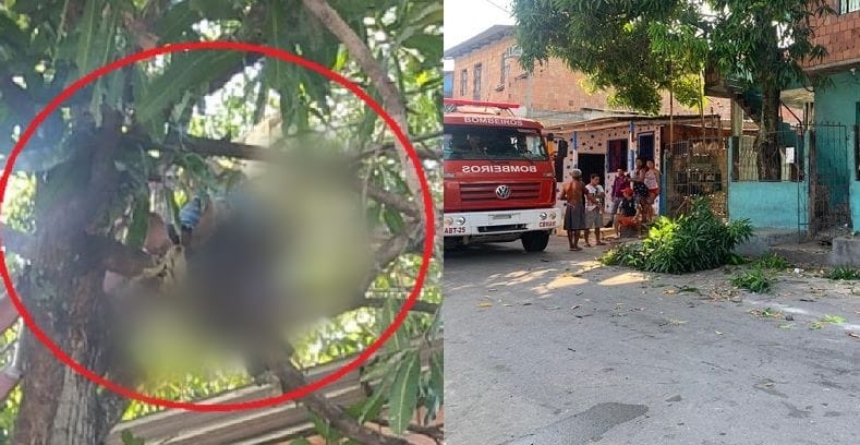 Com fome, o homem não teria percebido que entre os galhos haviam os fios. Ele morreu na hora e ficou pendurado na árvore.
