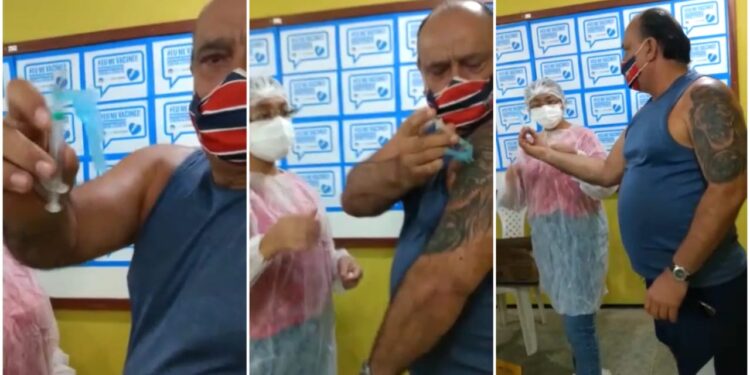 Em um vídeo, o homem aparece conversando com profissionais da saúde, já posicionado para receber o imunizante. A auxiliar de enfermagem, ergue o braço e mostra ao homem a seringa preparada. É quando ele toma o imunizante das mãos dela, aponta para a câmera do colega que estava filmando e, logo em seguida, de forma brusca, aplica a vacinação no próprio braço.